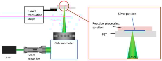 - Liu, Y.K.; Lee, M.T. Laser direct synthesis and patterning of silver nano/microstructures on a polymer substrate. ACS Appl. Mater. Interfaces 2014, 6, 14576–14582. [Google Scholar] [CrossRef] [PubMed]