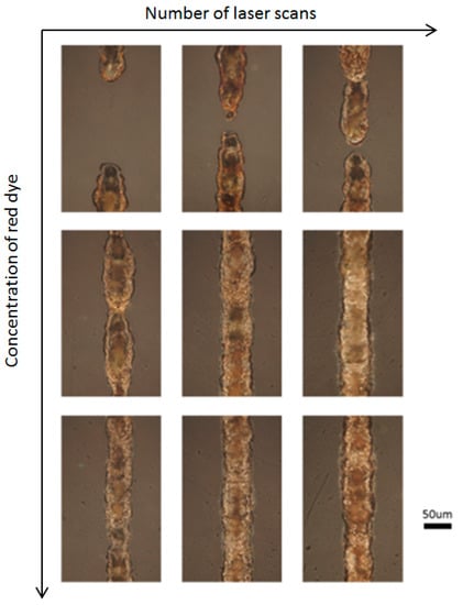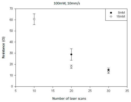 In this study, the laser power was fixed at 100 mW, and the laser scan speed was 10 mm/s. The number of laser scans and the red-dye concentrations were varied to conduct the parametric studies. Figure 3 shows the silver lines fabricated by the LDSP process on PET substrate with a range of different laser scans (10×, 20×, 30×) and red-dye concentrations (4 mM, 8 mM, 16 mM, based on the mixed process solution). It can be clearly seen that the 4 mM red-dye process solution did not yield a continuous silver line even when the maximum number of scans (30×) was applied. The formation of such broken lines also indicates that the thermochemical reduction of silver ions on the PET surface is not uniform and steady. The temperature and the reactant concentration are two major factors affecting the chemical reaction rate and it is possible that the concentration of reactants and the red dye was not uniform along the laser scan path. In these experiments, the red dye in the reactive solution absorbs laser energy and participates in radiative heat transfer. The reaction temperature and thermally induced convection is affected by the absorption of the red dye in the solution and although the process solution appears to be homogenous, there could still be microscale fluctuations in concentration. Thermally induced fluid motion such as buoyancy-driven flow, the Soret effect, and Brownian motion will also affect the concentration of species in the solution []. These fluctuations are highly random, especially for solutions of low red-dye concentration, and increasing the number of laser scans can build the line incrementally. Nevertheless, for a real application, the number of scans should be minimal and the red-dye concentration was increased to improve uniformity and the absorption of laser light. As can be seen in Figure 3, the silver lines fabricated using a red-dye concentration of 8 mM yields continuous conductive lines after 20 laser scans and 10 laser scans were enough to give continuous lines with a 16 mM solution. The width of the deposited line is approximately 50 μm. The size and the resolution of the conductive patterns being fabricated by the LDSP process is mainly controlled by the size of the heat affect area [], which are determined by the process parameters such as the laser intensity, scanning speed, and heat transfer properties of the process solution. In addition, the size and morphology of the LDSP deposited patterns could also be controlled with the assistance of microfluidic dispensers [] in conjunction with adjusted laser parameters. Figure 4 shows the electrical resistivity, where measurable, of these silver lines. The resistivity decreased to become stable with an increase in the number of laser scans or red-dye concentration. It should be noted that, for the 16 mM solution, silver lines with 20 laser scans and 30 laser scans yield compatible resistivity, which suggests that the effective thickness of the line did not increase significantly with more than 20 laser scans. A similar trend had also been observed earlier [,]. This effect is attributed to the fact that, as the thickness of the silver line increases, it begins to reflect the incident laser light, the energy is no longer absorbed by the process liquid, and the chemical reaction therefore stops.