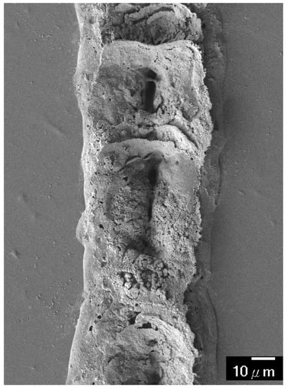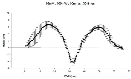 Figure 5 shows the silver line fabricated with the 16 mM process solution and 30 laser scans. The rough surface mainly results from solution flow and the possible sintering of silver nanoparticles that were produced during the laser scan [], which could be improved by increasing the viscosity of the fluid []. The cross section of the silver line exhibits a concave shape. This surface morphology is one of the typical shapes found for patterns fabricated by laser chemical vapor deposition (LCVD), which is similar to the mechanism of LDSP. The formation of the morphology is closely related to the temperature distribution, the transport of reactants and products in the liquid (in this case, possibly silver nanoparticles being produced during the laser scan) and the surface diffusion of species []. The concave and round shape indicates strong impact from capillary-driven flow and thermophoresis, which are significant when the local temperature gradient in the fluid near the laser focal spot is large.