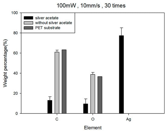 Figure 6 shows the results of energy dispersive X-ray analysis (EDX) analysis. It can be seen that the PET substrate after the LDSP in the process solution without silver acetate (but with red dye) contains no silver element, and the ratio of carbon to oxygen slightly increased compared with the original PET substrate. It can be assumed that very little red dye would be sintered and deposited on the PET substrate during the LDSP process. Silver lines fabricated with the process solution containing silver acetate shows dominant silver content and a small amount of carbon and oxygen. The carbon and oxygen could be from the red dye embedded in the silver line. These carbon and oxygen components in the conductive pattern are thought to be the main reason for its higher resistivity compared to pure silver.