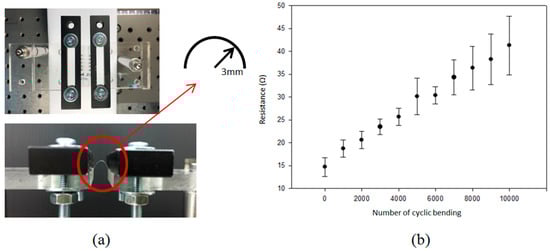 Figure 7 shows the morphology of the cross section of the silver lines fabricated with LDSP (16 mM process solution, 30 laser scans). The measurements were carried out using a white light interferometer. The concave morphology can be clearly seen. The negative value at the center of the silver line could be attributed to slight melting of the PET substrate during the LDSP process. Using the average altitude profile shown in Figure 7 to calculate the cross-sectional area of the line, and assuming the canyon at the center under the plain substrate surface does not contribute to significant electrical conductivity, the electrical resistivity of the silver line was estimated to be 2.25 × 10−7 Ω·m, which is approximately 10 times that of pure silver. This can again be attributed to the fact that the composition of the conductive line contains a fraction of carbon and oxygen. Nevertheless, the conductivity of the line is sufficient to conduct electricity effectively as demonstrated in Figure 8. The durability test apparatus and the results are shown in Figure 9. After 10,000 repetitive bends, the drift in electrical resistance of the silver line was approximately 3 times higher than the initial value. Referring to the microstructures of the silver line showing in Figure 9b, there are silver micro-flakes that tend to be easily deformed and deteriorated. The variation in the electrical property is mainly attributed to the change in mechanical structure of the line. Further effort should be made to improve the mechanical robustness and the durability of the conductive patterns fabricated by this technique. It should also be noted that the processing speed could be increased by increasing the laser intensity, the absorptivity, and/or the reactivity of the process solution. The productivity of the LDSP process can thus be improved.