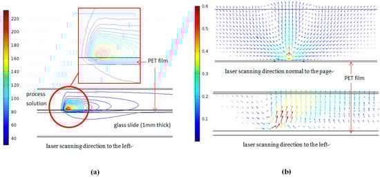 Figure 10a shows the temperature profile of the cross section at the center of the laser beam in the scan direction. It can be seen that the highest temperature spot is inside the reaction fluid and is some tens of microns above the PET surface. In contrast to the previous studies where the laser beam energy was absorbed by the polymer substrate itself, so that the highest temperature in the reaction fluid was on the interface between the solid substrate and the fluid, the process solution absorbs the incident laser energy gradually along the laser path within the fluid, and the hottest spot is in the interior of the process fluid region. This, in turn, results in a strong in-plane flow right on the PET surface below the hottest spot. Strong in-plane flow, especially near the centerline (the symmetric line), could adversely affect the deposition and adhesion of the reduced silver (from the hottest spot) on the PET surface. Additionally, the symmetric swirling flow as shown in Figure 10b indicates that the reduced silver could precipitate on the shoulders along the laser scanning path, which also corresponds to the morphology of the silver line patterns shown in Figure 5. It should also be noted that the upward flow at the centerline due to buoyancy exists with an absorptive substrate (polyimide) or an absorptive fluid as in the current case. The morphology of the deposited pattern, however, is closely related to the intensity of the buoyancy flow, which generally increases with laser intensity, which determines the temperature of the focal point []. Other forces such as surface tension would be important for improving the surface morphology []. Furthermore, the roughness of the surface of the deposited patterns could yield a random scattering of the incident laser irradiation []. Thus, the reflectance to the laser light by the deposited patterns should be carefully considered. Continuous study in this regard is being carried out.