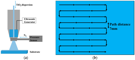 Schematic representation of (a) setup for the spray coater and (b) the spray nozzle moving path.