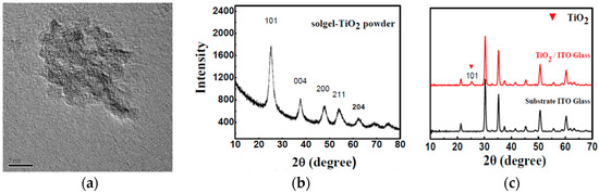 (a) Transmission electron microscopy (TEM) image of the TiO2 nanoparticles dispersed in ethanol at a concentration of 1.0 mg/mL; (b) XRD pattern of the TiO2 powder drying at 135 °C; and (c) XRD patterns of ITO-glass with/without the TiO2 compact layer coated by the ultrasonic spraying.