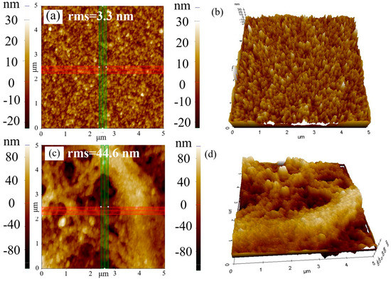 Atomic force microscope (AFM) images of the surface of the TiO2 layers sprayed by (a,b) the w-film; (c,d) the d-film using the TiO2 ethanol solution without TAA.