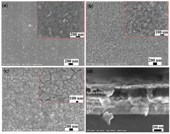 Scanning electron microscopy (SEM) image of (a) PEN-ITO substrate; (b) TiO2 compact layer; (c) perovskite prepared by the gas-assisted method; and (d) cross-section SEM image of the PSCs.