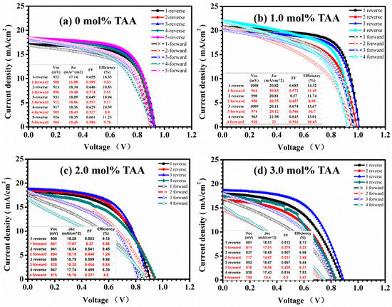 J-V characteristics of the gas-assisted processed PSCs based on TiO2 compact layer deposited by the ultrasonic spray-coating of TiO2 solution with the addition of TAA (a) 0 mol %; (b) 1.0 mol %; (c) 2.0 mol %; (d) 3.0 mol % with respect to the TiO2 content.