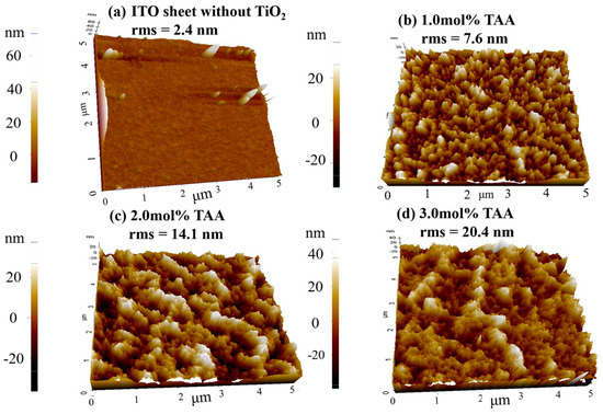 AFM images of the surface of the TiO2 layers sprayed by the TiO2 ethanol solution with the addition of TAA, (a) ITO sheet without TiO2 film; (b) 1.0 mol % TAA; (c) 2.0 mol % TAA; and (d) 3.0 mol % TAA with respect to the TiO2 content.