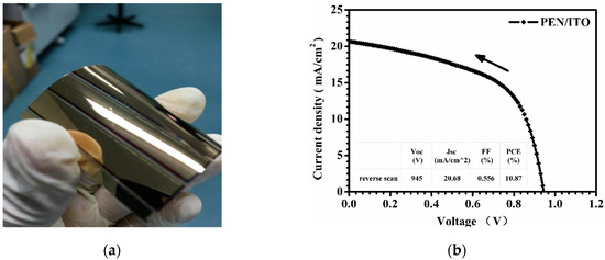 The optimized process of the ultrasonic spraying of 1.0 mg/mL TiO2 solution with an addition of 1.0 mol % TAA was employed to fabricate PSCs on the flexible ITO-PEN substrate. A photographic image of the flexible device with a large area of 5.0 cm × 5.0 cm is shown in Figure 8a. The best-performing cell exhibited an outstanding photovoltaic performance with a Voc of 945 mV, a Jsc of 20.68 mA/cm2, a FF of 55.6% and a PCE of 10.87%, tested under AM 1.5 G sunlight (100 mW/cm2) using a metal mask of 0.16 cm2 (Figure 8b), which offers great potential for flexible PSCs with a large area. Figure 9 shows the current-voltage curve of a flexible large-area PSC with an active area of 13.5 cm2, tested without a mask under standard sunlight. A PCE of 4.33% was achieved for the large-area flexible PSC.
