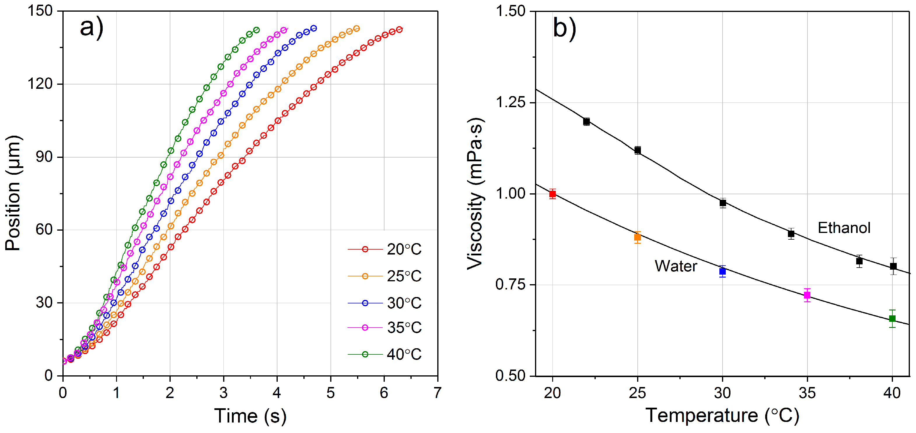 4.2. Viscosity of Water and Ethanol as a Function of Temperature