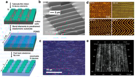 Recent development of wavy design has led to more complicated three-dimensional (3D) structures that buckle at higher orders, indicating potential applications of these technologies to form miniaturized flexible and stretchable electronics with highly spatial complexity and capability to achieve predefined shape shifting and function alternation [33]. The wavy design has been wildly available to integrate silicon [24], carbon nanotubes [34,35,36], graphene [37] and ferroelectrics [38] in formats of nanoribbons (Figure 1b) [24], nanowires (Figure 1c,e) [39], and nanomembranes (Figure 1d) [40]. However, the stretchability of the wavy design is determined by the prestrain levels of the substrates and the bending curvature of the materials as shown in Equations (1) and (2), limiting the applications of this technology in situations that require larger stretchability and less complex fabrication processes. As a result, island–bridge configurations have been developed to offer improved stretchability with both out-of-plane and in-plane structures in which islands based on functional sensing and circuit elements are mechanically and electrically connected with bridges made of narrow polymeric and metallic strips. The bridges, which contain either straight or serpentine interconnects, are freely suspended or bond on substrates between two islands. The stretchability of such structures are achieved either by deformation of the spatially buckled bridges (Figure 2a) or planar deformation of the interconnects (Figure 3c).