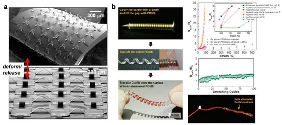 Examples of out-of-plane strcutres with high stretchability: (a) SEM images of arrays of complementary metal-oxide semiconductor (CMOS) inverters with spatially buckled bridges (Reprinted with permission from Ref. [29] Copyright 2008 National Academy of Sciences); and (b) helical-structured copper nanowire (CuNW)-based electrodes (Reprinted with permission from Ref. [41] Copyright 2014 Nature Publishing Group).