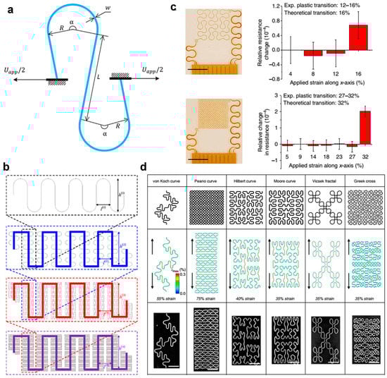 A fractal design concept that allows formation of stretchable layouts through stepwise iterations of basic shape units has been introduced to realize highly stretchable lithium-ion batteries [43] as well as several epidermal sensors [31,44,49]. As illustrated in Figure 3b, a fractal-based layout is created from the first order of serpentine geometry, and then constructed by connecting multiple copies of the unit cell forming self-similar design that offers increased area coverage and improved stretchability [48]. Theoretical models have been developed to analyze the deformation and stretchability of the fractal geometry. Fan et al. [45] have studied the deformations of various fractal layouts (Figure 3d), using a finite element method (FEM) followed by experimental evaluation. They also introduced a high precision approach to measure the elastic-plastic transition (or the elastic stretchability) through measuring differential resistances of the fractal interconnects, showing reasonable consistency with numerical analysis (Figure 3c). Several analytical models have been developed to determine elasticity for fractal interconnects. For example, Zhang et al. [48] have developed analytical models of flexibility and elastic stretchability, through establishing recursive formulae at different fractal orders. The analytical models show that the stretchability of system increases with the order of self-similar interconnect, and a surface filling ratios of 50% would yield 70% stretchability. In addition, the tensile stiffness for fractal interconnects has been determined by analytic approach, and has been verified by finite element analysis and experiments [50].