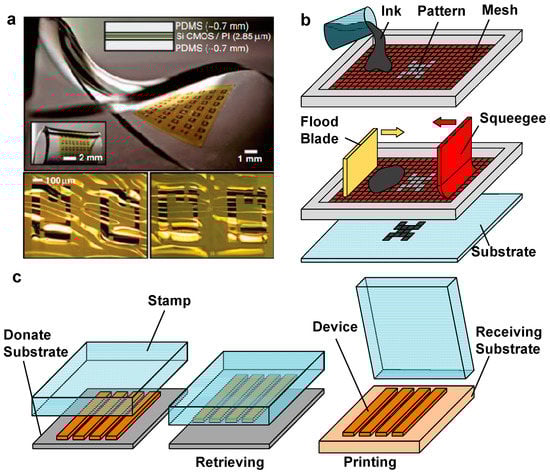 (a) Stretchable integrated circuits fabricated based on CMOS technology (Reprinted with permission from Ref. [26] Copyright 2008 American Association for the Advancement of Science); (b) a schematics of the screen printing process; and (c) a schematics of the transfer printing process.