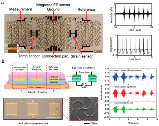 Examples of skin sensors for biopotential measurement: (a) biopotential measurement using skin-contacted metallic electrodes (Reprinted with permission from Ref. [91] Copyright 2013 John Wiley and Sons); and (b) an epidermal electronic system (EES) with a capacitive sensor for electrophysiological (EP) measurement (Reprinted with permission from Ref. [18] Copyright 2014 John Wiley and Sons).