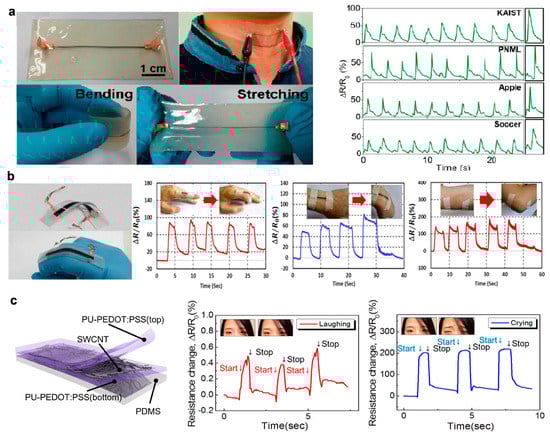Strain sensors can be directly attached on skin to measure strain induced by skin deformations caused by respiration, heartbeat, bending of body joints and muscle activities. Strain sensors can be fabricated by diverse materials and methods [17,150,151] with applications ranging from personalized health-monitoring [152,153] to human-machine interfaces [154,155] and soft robotics [156,157,158]. Park et al. [17] have achieved a stretchable graphene strain sensor using a layer-by-layer assembly method, in which stretchable yarns are repeatedly dip-coated with poly(vinyl alcohol) and graphene nanoplatelets bilayer. This strain sensor can be attached to throat and monitors the motions caused by speaking with maximum stretchability of ~100% (Figure 6a). Surface matrixes made of carbon nanotube and silicone rubber have been used to make strain sensors (Figure 6b). Carbon nanotubes were first coated onto a patterned polyimide film through air spraying, and were then transferred onto an Ecoflex film by casting uncured Ecoflex onto a polyimide film. The carbon nanotubes and Ecoflex form surface matrix that can be separated from the polyimide after the curing of the Ecoflex, resulting in conductive composite with high stretchability (~500%), linear temperature response (R2 = 1) and fast time response (~332 ms) [150]. Majidi et al. [151] have developed thin-film curvature sensors composed of microfluidic channels filled with liquid metal (eGaIn) embedded in PDMS or Ecoflex substrates. The sensors can offer up to 1000% stretchability and measure both bending curvature and strain within the substrates with a gauge factor of 2 and a Young’s modulus of 0.1~1 Mpa. Roh et al. [87] have realized a transparent and patchable strain sensor that is made of a sandwich-like stacked piezoresistive nanohybrid film of single-wall carbon nanotubes (SWCNTs) and a conductive elastomeric composite of polyurethane (PU)-poly(3,4-ethylenedioxythiophene) polystyrenesulfonate (PEDOT:PSS). This sensor can offer stretchability of up to 100% and optical transparency of 62%, which can detect small strains on human skin (Figure 6c).