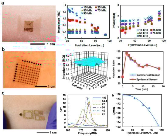 Skin hydration can be determined by measurements of electrical impedance, thermal conductivity, spectroscopic property, and mechanical characteristic in conventional approaches. The application of epidermal electronic techniques gives hydration sensing many advantages over traditional methods. Huang et al. have realized several types of epidermal hydration sensors based on detection of skin electrical impedance. The sensors consist of two electrodes connecting with a data acquisition system, which provides alternating electrical current at frequencies between 1 and 100 kHz. The skin electronic impedance can be reflected by resulting attenuation and phase shift of the electrical current. Devices capable of conducting differential monitoring [14] (Figure 8a), regional mapping [27] (Figure 8b), and wireless sensing [15] (Figure 8c) have been developed based on the impedance detection. In addition, hydration can also be assessed through measurements of skin thermal conductivity, which can be determined by time response of skin to constant thermal energy input [159].