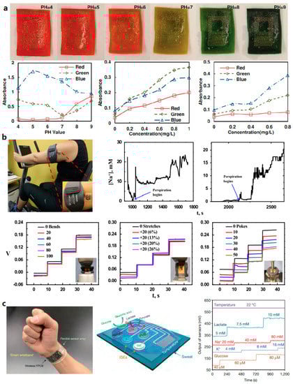 Flexible and stretchable skin sensors can be utilized for biomolecule analysis. Various biomolecules in sweat (e.g., sodium [12,168,169,170], potassium [12,169], ammonium [171,172], glucose [173], and lactate [12,174]) have been regarded as indicators for human physiological health. Huang et al. have explored materials and design strategies for integrating stretchable wireless sensors on porous sponge-like elastomeric substrates for epidermal analysis of biomolecules in sweat (Figure 9a). The porous substrates allow sweat collection through capillary forces, without need for complex microfluidic handling systems. Colorimetric measurement is achieved in the same system by introducing indicator compounds into the substrates for sensing specific components (OH−, H+, Cu+, and Fe2+) in sweat [13]. Bandodkar et al. [175] have developed an epidermal tattoo-like sensor using a bluetooth enabled wearable transceiver for real-time monitoring of sodium in human perspiration with concentration range of 0.1–100 mM. This sensor can withstand strain caused by bending, stretching and poking (Figure 9b). Gao et al. [12] have designed a fully integrated sensor array for in situ perspiration analysis, which can simultaneously and selectively measure sweat metabolites (e.g., glucose and lactate) and electrolytes (e.g., sodium and potassium ions) as well as the skin temperature for sensor calibration (Figure 9c).