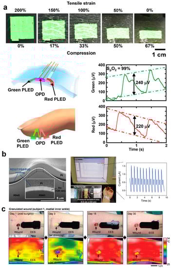 Flexible and stretchable skin sensors also have other applications, including oximetry [21,176,177], pressure sensing [178,179] and wound healing monitoring [180,181]. For example, Yokota et al. [177] have developed optoelectronic skins integrated with OLED and organic photodetectors, which can measure the oxygen concentration of blood based on a photoplethysmogram (PPG) approach (Figure 10a). Choong et al. [182] have demonstrated a stretchable resistive pressure sensor within which the conductive electrode is built on the micro-pyramid PDMS arrays grafted with a PEDOT:PSS/PUD composite polymer. The sensor offers a pressure sensitivity of 10.3 kPa−1 when stretched by 40% (Figure 10b). Hattori et al. [180] have established an epidermal electronics system that can monitor cutaneous wound healing by recording time-dynamic temperature and thermal conductivity of skin. This system consists of metal traces with fractal and filamentary serpentine (FS) configurations, which can offer stretchability of ~30% (Figure 10c).