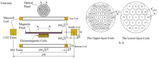 As shown in Figure 1, the primary elements of the MFDM are a layer of magnetic fluid, a thin film of a reflective material coated on the free surface of the fluid, a two-layer layout of the miniature electromagnetic coils placed underneath the fluid layer, and a Maxwell coil. The properties of the magnetic fluid used in this paper are given in Table 1, and they are stable colloidal suspensions of nano-sized, single-domain ferri/ferromagnetic particles and can be coated with a silver liquid-like thin film to improve the reflectance.