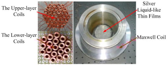 A snapshot of the assembly of the mirror is shown in Figure 2. The two-layer layout of the miniature electromagnetic coils is placed within the Maxwell coil and a container filled with a 1-mm-deep layer of ferrofluid sits on top of the miniature coils, which are coated with the thin silver liquid-like film.