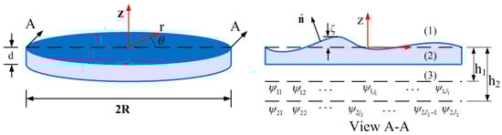 The proposed MFDM is represented by a cylindrical horizontal layer of a magnetic fluid as shown in Figure 3. The top free surface of the fluid layer is coated with a reflective film and serves as the deformable surface of the mirror. The deflection of the mirror surface at point (rk, θk) is denoted by ζ(rk, θk, t), where k = 1,2,3,…,K is a discrete number of surface locations. The magnetic field generated by any given coil, centered at the horizontal location (rij, θij), is idealized as that of a point source of magnetic potential ψij(t), where i = 1,2 is the ith layer of actuators, and j, j = 1,2,3,…, Ji is the jth coil of each layer.
