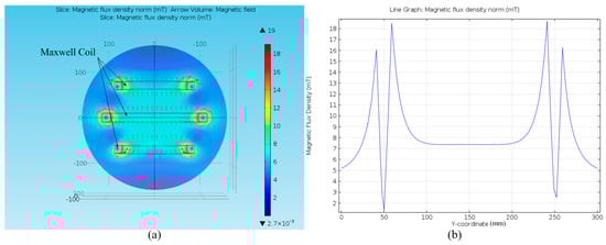 (a) The geometric model of Maxwell coil in COMSOL; (b) the curve of the magnetic field distribution on the center plane.