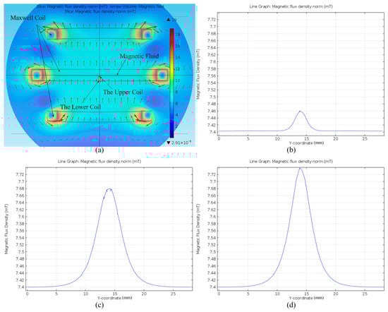 (a) The geometric model of MFDM in COMSOL; (b) the superposition of magnetic fields of the center coil in the upper layer and the Maxwell coil on the mirror surface; (c) the superposition of magnetic fields of the center coil in the lower layer and Maxwell coil on the mirror surface; (d) the superposition of magnetic fields of the two center coils and Maxwell coil on the mirror surface.