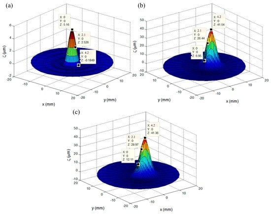 The surface deflection contour of the MFDM; (a) coil 1 in the upper layer is active; (b) coil 2 in the lower layer is active; (c) both coils are active. The measured points are selected at (0,0), (2.1,0), (4.2,0), respectively.