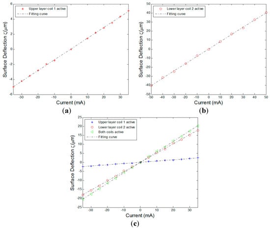 The linear response of the mirror surface deflection is simulated and verified in the COMSOL and MATLAB (version 2011a, Mathworks Inc., Natick, MA, USA) co-simulation environment. The lower-layer coils can provide a large stroke deflection due to the relatively large size of the electromagnetic coils compared with the upper-layer coils. Based on the structure parameters of the coils in each layer, the corresponding magnetic potentials are obtained in COMSOL with the analytical model of the MFDM developed in MATLAB. When the Maxwell coil is turned on with a current of 500 mA, the simulation results of the surface deflection contour are shown in Figure 6. In Figure 6a, it can be seen that the maximum deflection magnitude is 5.16 µm at (0,0) when coil 1 in the upper layer (see Figure 1) is active at 35 mA. In Figure 6b, the maximum deflection magnitude is 41.54 µm at (4.2,0) when coil 2 in the lower layer (see Figure 1) is set to 50 mA. When both coils are active, Figure 6c indicates that the surface deflection of the mirror is the linear sum of the deflections generated by each of the two coils separately.
