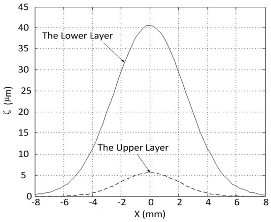 In this section, the experimental results of the surface response of the mirror for different cases are presented to verify the response characteristics of the MFDM. The surface deflection with respect to the different input currents was measured using Polytec OFV 5000/552 and VIB-A-T31. During operation, the Maxwell coil was driven with a constant current of 500 mA, which produced a measured 7.43 mT uniform magnetic field inside of the Maxwell coil. In Figure 7a, the points marked as “*” signify the peak surface deflections of the MFDM when coil 1 in the upper layer (see Figure 1) is active. The experimental peak surface deflections for the case when coil 2 in the lower layer (see Figure 1) is active are marked as “ο”, as shown in Figure 7b. It is obvious that the surface deflections varied linearly with the increasing currents and both negative and positive deflections were achieved. As illustrated in Figure 7c, when the two coils are energized, the surface deflection (“Δ”) at a point midway between the two coils is the linear sum of the deflections (“*” and “ο”) at the point generated by each of the two coils separately. Similar to the simulation results, the maximum surface deflections driven by the single upper-layer or lower-layer coil can reach up to 5 µm and 40 µm, respectively. The corresponding influence functions of a single coil in the upper layer with an applied current of 35 mA or the one in the lower layer with a current of 50 mA are shown in Figure 8. As can be observed from the figure, the application of current to a single coil resulted in a Gaussian surface shape with its peak located immediately above the location of the energized coil, corresponding to a neighbor coupling constant of about 49% and 17% for the upper-layer and lower-layer actuators, respectively.