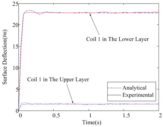 It should be noted that using Equations (12)–(14), the static surface response model of the mirror with respect to the perturbed magnetic field produced by each actuator can be obtained. Then the parameters of the coils in both layers as listed in Table 2 are designed based on the static model of MFDM so that the desired surface deflection of 5 µm by the single actuator in the upper layer and the deflection of 40 µm by the one in lower layer can be both produced. The ratio of the diameters of the coils in the lower and upper layers is finally rounded to have a factor of two so that the same pupil can be covered by the actuators in each layer.