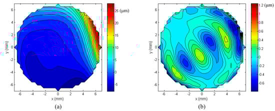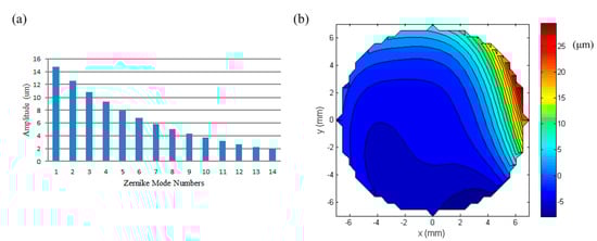 In this section, the mirror was used to produce a targeted wavefront which was expressed as a combination of typical Zernike modes. The amplitudes of each Zernike mode, Z1 to Z14, is shown in Figure 13a and the corresponding wavefront with a RMS value of 5.6341 μm is shown in Figure 13b. The input currents of the lower-layer coils of the MFDM were first calculated on account of the aberration with all 14 Zernike modes, and then the upper-layer coils were activated to correct the resulting residual wavefront error produced by the lower-layer coils. The final produced wavefront is presented in Figure 14, which shows a residual wavefront RMS error of 0.2263 μm.