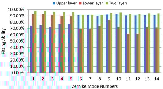 Figure 15 shows the effectiveness of the MFDM for the correction of aberrations in each Zernike mode, as shown in Figure 13a. The Y axis displays the fitting ability of the MFDM for each Zernike mode, which is calculated as , where and denote the measured and the target wavefront values at the 31 × 31 subaperture positions of the wavefront sensor, respectively. The blue bars in Figure 15 show the correction capability of the upper-layer coils for different Zernike modes. It indicates that the upper-layer coils have a high correction performance for high-order aberrations, but the performance decreases for low-order aberrations, mainly due to the small amplitude of the surface deformation they can produce. However, the correction capability of the lower-layer coils is contrary. The red bars in Figure 15 indicate their high correction capability for low-order aberrations, but the correction performance drops down for high-order aberrations due to the low density of the lower-layer actuators. If both layers of the coils are activated, as seen from the green bars in Figure 15, the correction capability of the MFDM can be improved for all Zernike modes. These comparison results illustrate that the proposed MFDM with a two-layer layout of actuators can effectively improve the correction performance, especially for the cases that deal with aberrations featuring high-amplitude low-order modes and low-amplitude high-order modes simultaneously.