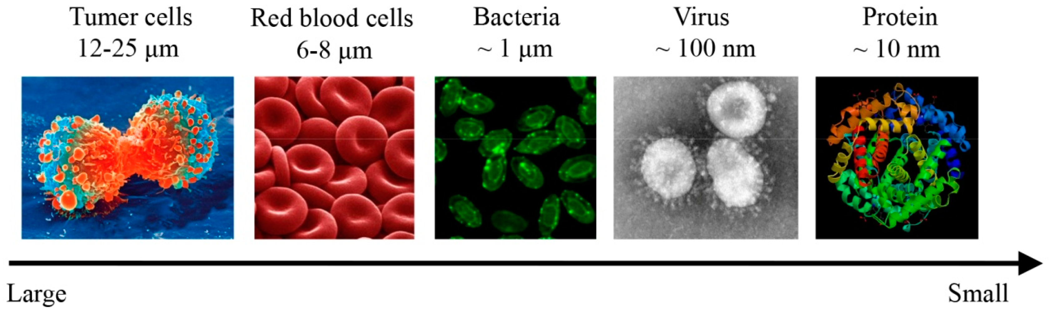 - Hosokawa, M.; Hayata, T.; Fukuda, Y.; Arakaki, A.; Yoshino, T.; Tanaka, T.; Matsunaga, T. Size-selective microcavity array for rapid and efficient detection of circulating tumor cells. Anal. Chem. 2010, 82, 6629–6635. [Google Scholar] [CrossRef] [PubMed]