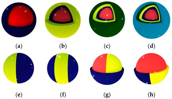 Multiple emulsion drops can be classified into four main categories: single-cored, multi-cored, Janus, and multiple-compartment. Single-cored emulsion drops are onion-like structures containing only one drop at each hierarchical level. They are composed of one core liquid and multiple concentric shells surrounding the core. Depending on the number of phases, they can be divided into double, triple, quadruple, and quintuple drops composed of two, three, four and five phases, respectively (Figure 1). Multi-cored multiple emulsion drops contain the controlled number (two or more) of inner droplets at one or more hierarchical levels. The inner drops in multi-cored emulsions can be composed of single or distinctive liquids. Janus and ternary drops are biphasic or triphasic drops having two or three physically and chemically distinct surface domains, Figure 1.