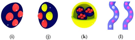 Different configurations and orders of multiple emulsion drops. (a) Double emulsion; (b) Triple emulsion; (c) Quadruple emulsion [15]; (d) Quintuple emulsion [15]; (e) Janus drop [64]; (f) Ternary drop [16,17]; (g) Janus core; (h) Janus shell [65]; (i) Drop with controlled number of inner drops [54]; (j) Drop with controlled number of distinct inner drops [66]; (k) High-order emulsions with controlled number of inner and middle drops [54]; (l) Hybrid microjet [67].