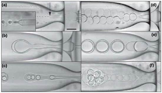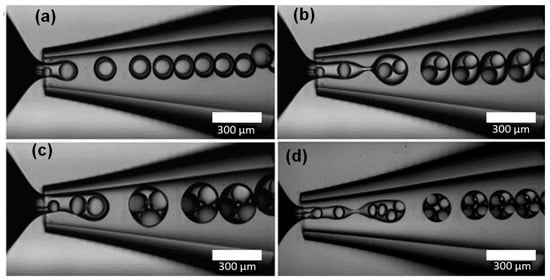 The same formation modes have been reported for the production of double and higher order emulsions in microfluidic devices. However, since inner and outer drops can be formed in different modes, wider variety of drop formation patterns can be achieved, Figure 3. Double emulsions are produced most controllably when both drops are formed in the dripping regime (Figure 4d), leading to very uniform drops and shells [14]. Uniform drops can also be formed in the dripping-to-jetting transitional mode. Here, the outer drops are formed in the jetting mode and the inner drops are formed in the dripping mode (Figure 4b–d). The benefit of this mode is that the number of inner drops can be controlled, typically in the range between 1 and 6 [101], by adjusting fluid flow rates, while keeping high uniformity of both inner and outer drops.