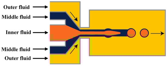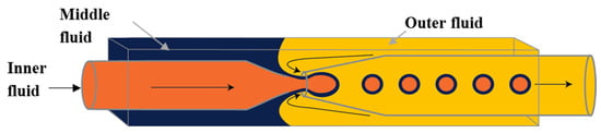 Schematic of production of double emulsion droplets in microfluidic flow focusing planar device with co-flow flow focusing geometry [118].