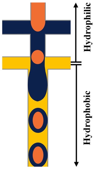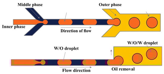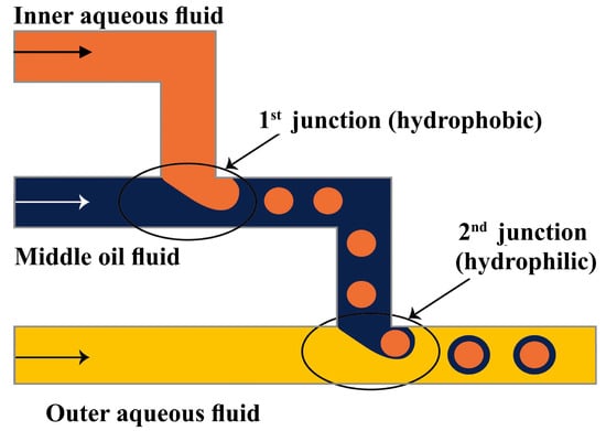 A Pyrex glass chip with two serial T-junctions was used for the production of double W/O/W emulsions [24,70]. The W/O drops are produced in the first hydrophobic junction followed by the formation of W/O/W drops in the second hydrophilic junction (Figure 7). The size of the drops and the number of the inner drops were controlled by varying the flow conditions and the size of the channels.