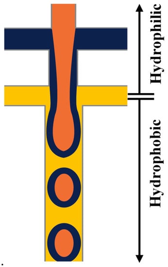 The drop formation in microfluidic devices occurs mainly in dripping and jetting regimes which are reported in all microfluidic geometries [14,82,83,84,85]. The squeezing mode is mostly reported in T-junctions and flow focusing devices [86,87,88,89,90,91,92], Figure 2. In addition, a tip streaming mode, resulting in controlled generation of submicron droplets, was reported in flow focusing devices at high viscosity ratios of the dispersed to continuous phase. The drop formation mechanism in each regime is different and governed by interaction of several forces, such as interfacial, viscous, inertial and gravitational [93]. The effect of gravity on drop formation can be neglected when the characteristic length, i.e., the drop diameter, is in the micrometre range (less than 1 mm) [94,95].