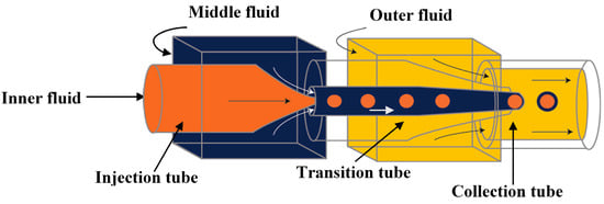 The three-dimensional (3-D) geometry of the glass capillary devices offers a controlled production of double emulsions [61,130]. These devices consist of borosilicate glass capillaries coaxially assembled on glass slides and can combine different co-flow and flow focusing drop makers [14,54,101,131,132,133,134]. A single emulsion device consists of one round capillary tube fitted inside a square capillary. In the co-flow geometry, the dispersed phase is delivered through the tapered injection tube and the continuous phase is introduced from the same direction through the coaxial area between the square capillary and the injection capillary tube [135,136]. In the flow focusing geometry, the dispersed phase is delivered through the square capillary, the continuous phase is introduced from the opposite direction through the coaxial area between the outer square capillary and the tapered inner tube, while the drops are formed and collected in the inner tube. Double emulsions were generated in two emulsification steps using two co-flow drop makers [54]. The device consisted of an injection tube (round capillary with tapered end) which was inserted in a transition tube (round capillary with a thick wall) which serves as a flow-focusing orifice for inner drops, and both were aligned within a square capillary tube. The other end of the transition tube was tapered and inserted into the collection tube (round capillary), which was also coaxially aligned (Figure 12).