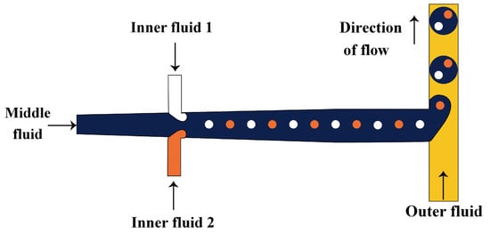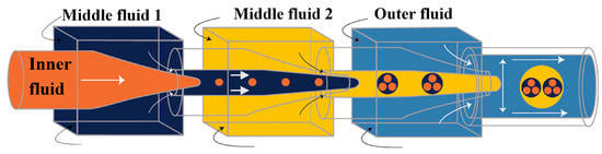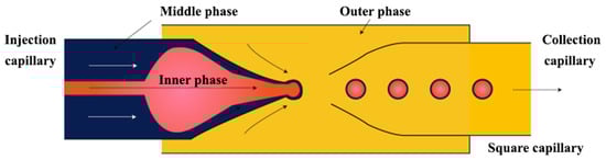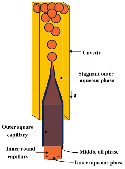 Double emulsion drops with ultrathin shell can be fabricated using flow focusing geometry but the resulted drop diameters are typically 20–300 μm, due to the high drag force exerted by the continuous fluid associated with a confined geometry of the collection tube (Figure 13). Double emulsion drops with larger size (in millimetres) and ultrathin shell are favourable in some applications, particularly in biotechnological sector [140]. A biphasic flow in a non-confined system was used to generate W/O/W double emulsions with millimetre size and with ultrathin middle phase in a single step process [81,140]. Unlike in the confined system, the droplets rupture under the dominant effect of the buoyancy. The device consists of a vertically oriented outer square and inner round glass capillaries which were tapered, coupled together and aligned coaxially, as illustrated in Figure 14. Both tips had the same vertical position for fabricating core/shell drops, whereas the inner tip was kept behind the outer tip for double emulsion drops with multiple inner drops [140]. The inner surface of the outer capillary was hydrophobic to favour the flow of the oil phase in the coaxial area between the two capillaries, while the outer surface of the outer capillary was hydrophilic for the contact with the outer phase. These aligned capillaries were inserted into a cuvette which served as a non-confined reservoir for the continuous fluid. Chaurasia et al. [81] developed a phase diagram to identify the relationship between the drop geometry and the process conditions. The droplets with a radius of ~100 µm to 1 mm and a shell thickness of 2–30 µm were formed in both dripping and jetting regimes. An increase in the surfactant concentration led to an increase in the shell thickness. The ultrathin shell was achieved when the inner fluid flow rate was at least ten times the middle phase flow rate [81].
