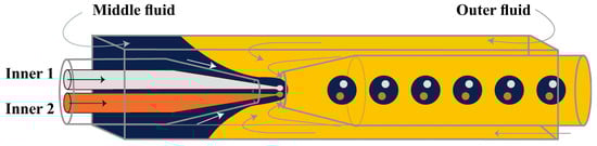 Glass capillary device with two coaxial injection capillaries was used for the formation of core/shell drops with ultrathin shells [31], Figure 16. A biphasic flow was created in the outer injection capillary consisting of a thin layer of the middle phase, which has a high affinity towards the wall of the capillary and surrounds the inner phase injected through the inner injection tube. The middle phase was confined in the capillary within a thin layer due to jetting of the inner phase. The outer phase was delivered between the square capillary and the outer injection capillary. The thickness of the solidified poly(lactic) acid (PLA) shell after solvent evaporation from the middle phase was less than 100 nm.