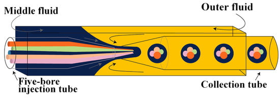 Zhao et al. [66] produced O/W/O emulsion with distinct oil cores using five-barrel capillary (tube with five separate internal channels) as the injection tube: four bores were used for different oil phases and one (central) bore was used to deliver the aqueous phase that was used to prevent the coalescence of the inner oil drops. The aqueous phase was also delivered through the area between the square outer capillary and the injection round capillary, as shown in Figure 19. The generated multiple emulsion drops were used as templates for the fabrication of photonic crystal barcodes composed of multiple photonic crystal or magnetically tagged cores embedded in hydrogel shell.