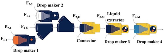 Higher order multicomponent multiple emulsions with diverse structures were produced using a flexible microfluidic device consisting of three basic building blocks: a drop maker, a connector and a liquid extractor (Figure 20) [61]. The drop maker is designed for generating drops; the connector is designed for collecting drops from different drop makers, and the liquid extractor is designed for removing excess continuous phase. This approach was used for the fabrication of capsules composed of a poly(N-isopropylacrylamide) (PNIPAM) thermo-responsive microgel shell, and oil core, and an eccentric magnetic core. The capsules were obtained by solvent evaporation and photopolymerisation of (O1 + O2)/W/O quadruple-component double emulsion [149].