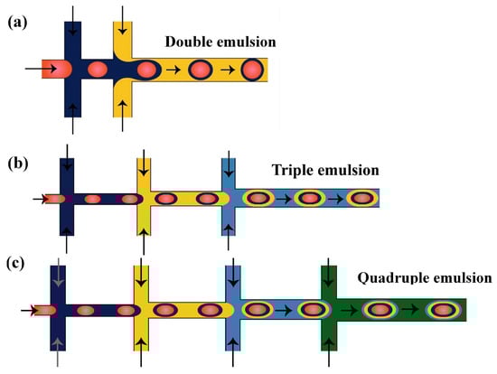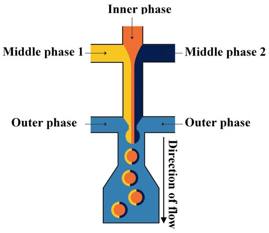 Microfluidic emulsification strategies offer the fabrication of multiple emulsions with complex drop morphologies and low polydispersity of less than 5% in a highly reproducible manner [19,51,53,54,55]. They can provide 100% encapsulation efficiency and accurate and independent control of: (i) the size of the drops at each hierarchical level [54,56,57]; (ii) the number and the type of inner drops nested inside each outer drop [54,58,59]; (iii) internal structure and shape of outer drops [59]; and (iv) the rate of droplet generation [60]. Different functional ingredients can be added independently and individually into both the inner and outer drops [56] during or after drop generation. Furthermore, distinct contents of the inner droplets can also be controllably introduced in the middle phase [61].