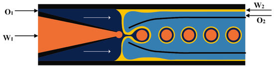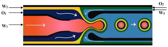 In the two-step method, double emulsions are generated in two drop makers with different surface wettabilities. The inner drops are formed in the first drop maker and then enveloped by the middle phase layer in the second drop maker. A series of two T-junctions [52,70,110], two flow-focusing units [76,111,112], two cross junctions [113,114,115], ad one T-junction combined with one flow-focusing unit [116] have been used for the two-step double emulsion production. Seo et al. [111] fabricated a PDMS device consisted of two consecutive flow-focusing drop makers with locally modified surface wettability, as shown in Figure 5. Two immiscible liquids (inner and middle phase) were injected in the first drop maker wetted by the middle phase. The outer phase was introduced in the two side inlets in the second drop maker to focus and break the middle phase jet. The core/shell drops were formed downstream of the second orifice, which was wetted by the outer fluid. The same device was used to generate core/shell drops consisting of aqueous aspirin solution in the core and aqueous solution of high molecular weight chitosan loaded with F3O4 nanoparticles in the shell [117]. The middle phase was crosslinked with glutaraldehyde to obtain magnetically responsive solid shell.