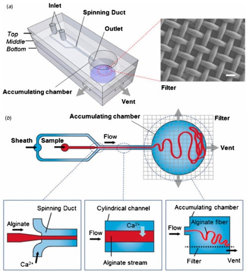 - Shin, S.J.; Park, J.Y.; Lee, J.Y.; Park, H.; Park, Y.D.; Lee, K.B.; Whang, C.M.; Lee, S.H. “On the fly” continuous generation of alginate fibers using a microfluidic device. Langmuir 2007, 23, 9104–9108. [Google Scholar] [CrossRef] [PubMed]