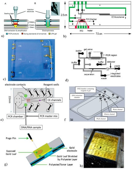 - Jha, S.K.; Chand, R.; Han, D.; Jang, Y.; Ra, G.; Kim, J.S.; Nahmb, B.; Kim, Y. An integrated PCR microfluidic chip incorporating aseptic electrochemical cell lysis and capillary electrophoresis amperometric DNA detection for rapid and quantitative genetic analysis. Lab Chip 2012, 12, 4455–4464. [Google Scholar] [CrossRef] [PubMed]
